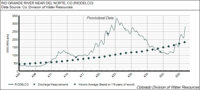 Streamflow data from the Colorado Division of Water Resources showed the RĆo Grande was flowing at 1,330 cubic-feet per second (cfs) when it came out of the mountains near Del Norte, Colo Wednesday (April 30).