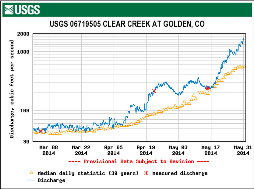 Clear Creek is roaring towards the South Platte River this morning. From email from USGS’s Water Watch: