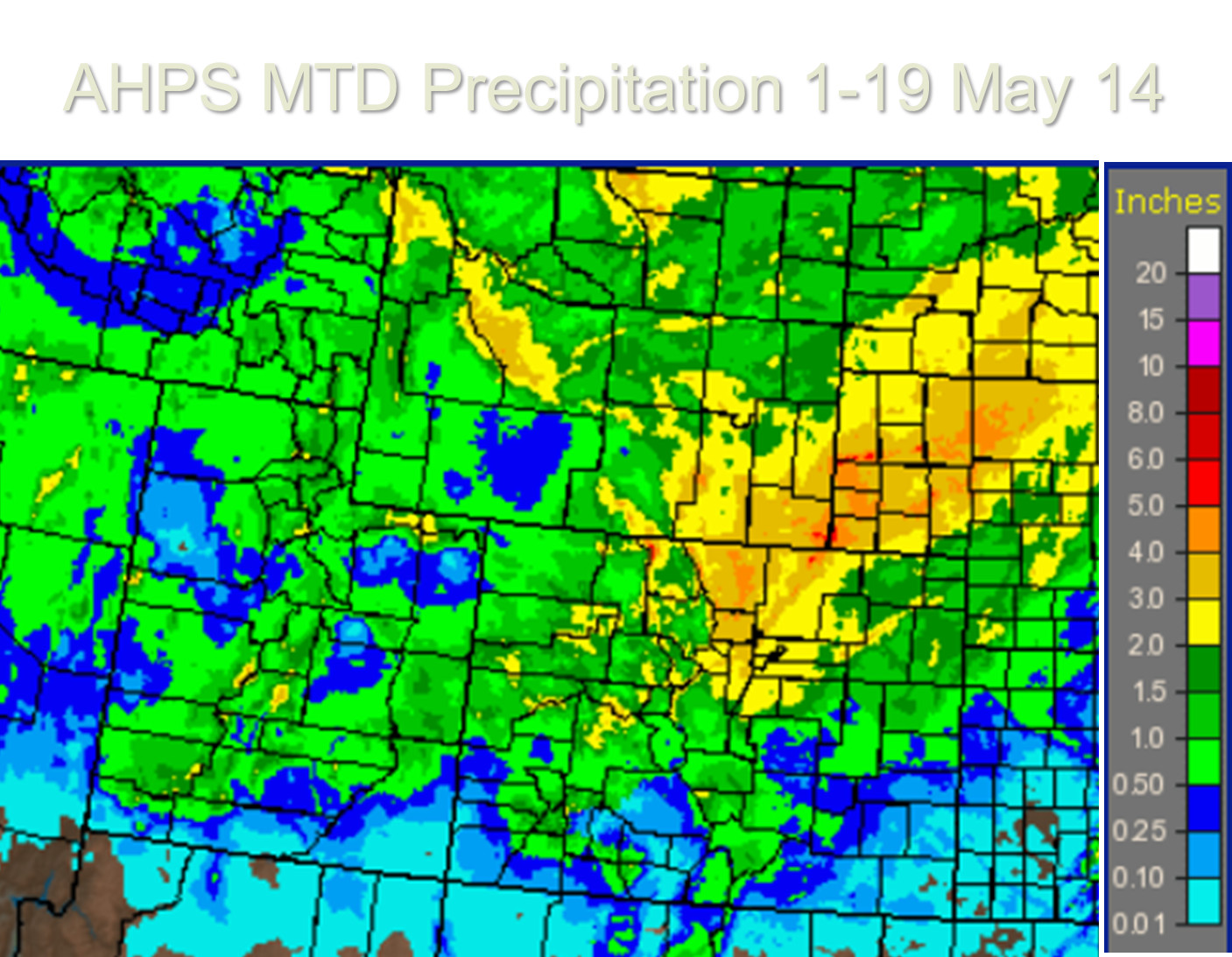 During the May 21-26, 2014 time period, precipitation is expected across the Plains, from South Dakota to northern Texas, and into eastern Colorado and Wyoming. Additional precipitation is expected around the Great Lakes and into the Mid-Atlantic and Northeast. Precipitation is estimated to approach two inches in select locations during this time period. At the same time, below normal temperatures are expected in the Southwest, east of the Rockies and into the Southern Plains. Above normal temperatures are expected along the West Coast, through the Central US, and into the Southeast.
