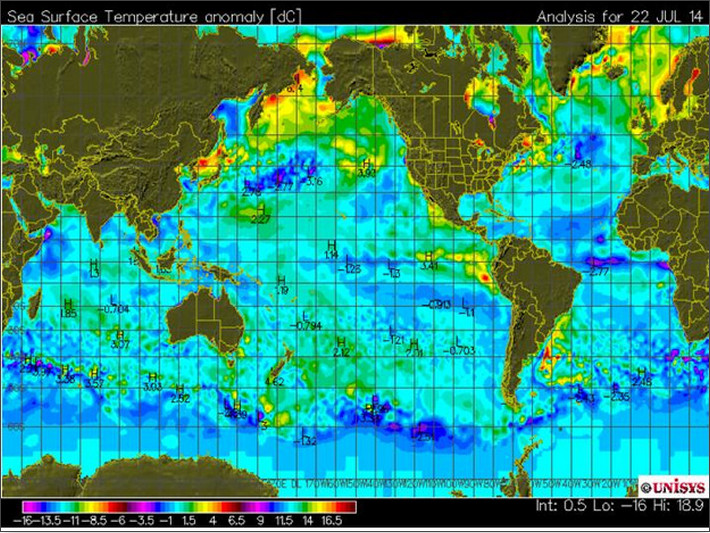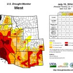 Somewhat similar to the southern Plains, abundant moisture triggered scattered moderate to heavy showers and thunderstorms in parts of New Mexico and southeastern Colorado, but totals quickly dropped to zero in western sections (e.g. most of Arizona, Utah, western Colorado, southeastern California). And like the southern Plains, the balancing of short-term wetness and long-term drought tempered the potential improvements in New Mexico and southeastern Colorado. Nevertheless, where decent rains (more than an inch) fell this week and Water Year-to-date surpluses existed, a 1-category improvement was made, namely in central New Mexico (north to south) – D3 to D2, and in southeastern Colorado. D3 was slightly expanded to reflect similar conditions at various time scales in north-central New Mexico and northeastern Arizona. In northeastern Utah, hot and dry conditions justified a general 1-category downgrade to reflect poor soil and vegetative health models. Monsoonal moisture made it north and west into the central Sierra Nevada and Lake Tahoe area, producing showers and thunderstorms that dropped 0.3-1 inches, locally to 3 inches, but these totals weren’t even close to making a dent in the long-term drought. In California, the June 30 reservoir update (based upon 154 intrastate reservoirs) had storage at 60% of average – better than this time in 1977 where storage was at a record low of 41%. Storage totaled 17.25 million acre feet (maf), and a typical seasonal withdrawal is 8.24 maf. The last two years (2012 and 2013), withdrawal has topped 11 maf. Due to early melting of this year’s meager snowpack, withdrawal through June 30 was already at 2.1 maf (versus average withdrawal through June 30 of less than 0.6 maf)…Looking Ahead