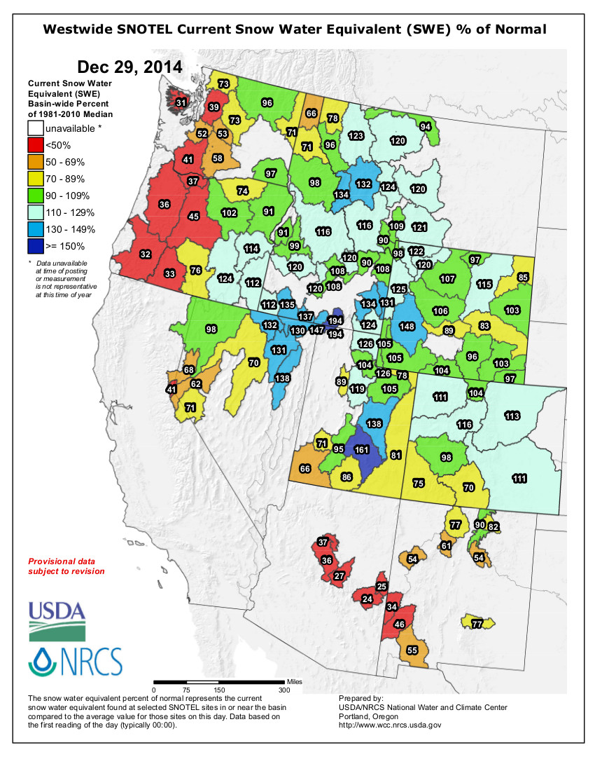 With the storm track shifting farther north, significant precipitation overspread the Northwest. December 25 became the snowiest Christmas Day on record in Wyoming locations such as Lander (9.6 inches) and Cheyenne (6.8 inches). With precipitation spilling across the High Plains, December 25-26 snowfall totals included 10.6 inches in Scottsbluff, Nebraska; 7.7 inches in Cheyenne, Wyoming; and 5.1 inches in Denver, Colorado. Across the western slopes of the northern Rockies, precipitation was heavy enough to result in some very slight trimming of dryness and drought. Closer to the Pacific Coast, and especially in the Cascades, an interesting winter continued to unfold. Since October 1, season-to-date precipitation in the Cascades has generally averaged 105 to 125 percent of normal. However, with an unusual amount of the precipitation falling as rain, the late-December snowpack contained only about one-third to one-half of its typical amount of water for this time of year—except closer to 75 percent of normal in the northern Cascades of Washington State. This discrepancy—overall wet conditions but meager snowpack—has led to some mixed drought indicators, such as favorable rangeland, pasture, and winter grain growth and improved soil moisture, while concerns persist with respect to the possibility of limited runoff into streams and reservoirs during the upcoming spring snow-melt season.