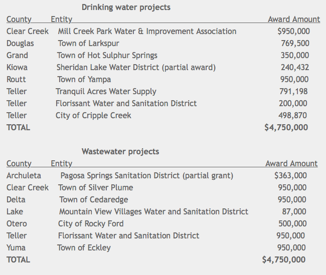 Funding for the grants was provided by the state Legislature under Senate Bill 09-165 and SB14-025. Governmental agencies, nonprofit public water systems and counties representing unincorporated areas of fewer than 5,000 people were eligible to apply for grants of up to $950,000.