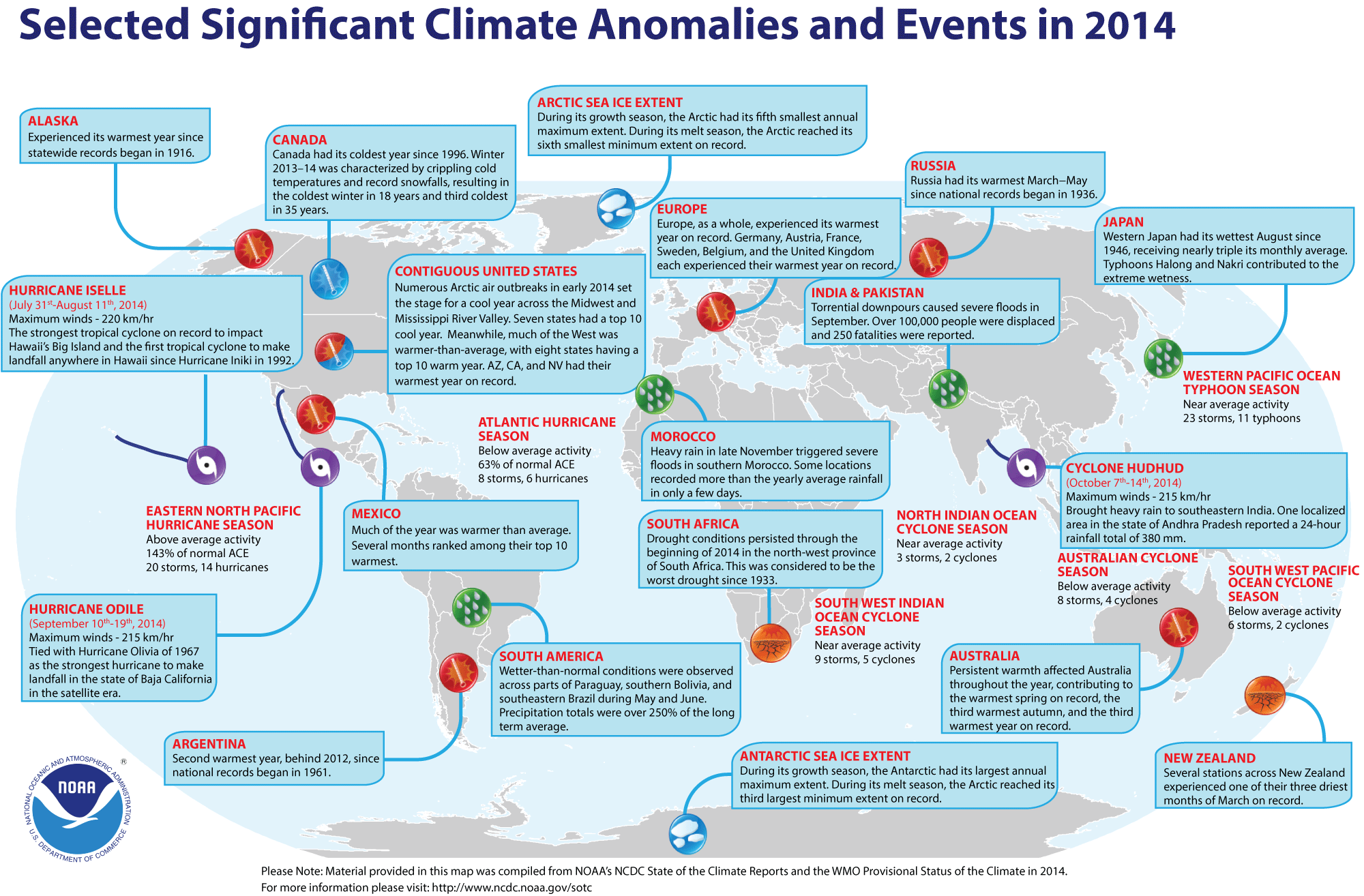 During 2014, the globally-averaged land surface temperature was 1.80°F (1.00°C) above the 20th century average. This was the fourth highest among all years in the 1880–2014 record. During 2014, the globally-averaged sea surface temperature was 1.03°F (0.57°C) above the 20th century average. This was the highest among all years in the 1880–2014 record, surpassing the previous records of 1998 and 2003 by 0.09°F (0.05°C). Looking above Earth’s surface at certain layers of the atmosphere, two different analyses examined NOAA satellite-based data records for the lower and middle troposphere and the lower stratosphere. The 2014 temperature for the lower troposphere (roughly the lowest five miles of the atmosphere) was third highest in the 1979-2014 record, at 0.50°F (0.28°C) above the 1981–2010 average, as analyzed by the University of Alabama Huntsville (UAH), and sixth highest on record, at 0.29°F (0.16°C) above the 1981–2010 average, as analyzed by Remote Sensing Systems (RSS). The 2014 temperature for the mid-troposphere (roughly two miles to six miles above the surface) was third highest in the 1979–2014 record, at 0.32°F (0.18°C) above the 1981–2010 average, as analyzed by UAH, and sixth highest on record, at 0.25°F (0.14°C) above the 1981–2010 average, as analyzed by RSS. The temperature for the lower stratosphere (roughly 10 miles to 13 miles above the surface) was 13th lowest in the 1979–2014 record, at 0.56°F (0.31°C) below the 1981–2010 average, as analyzed by UAH, and also 13th lowest on record, at 0.41°F (0.23°C) below the 1981–2010 average, as analyzed by RSS. The stratospheric temperature is decreasing on average while the lower and middle troposphere temperatures are increasing on average, consistent with expectations in a greenhouse-warmed world. According to data from NOAA analyzed by the Rutgers Global Snow Lab, the average annual Northern Hemisphere snow cover extent during 2014 was 24.95 million square miles, and near the middle of the historical record. The first half of 2014 saw generally below-normal snow cover extent, with above-average coverage later in the year. Recent polar sea ice extent trends continued in 2014. The average annual sea ice extent in the Arctic was 10.99 million square miles, the sixth smallest annual value of the 36-year period of record. The annual Antarctic sea ice extent was record large for the second consecutive year, at 13.08 million square miles.