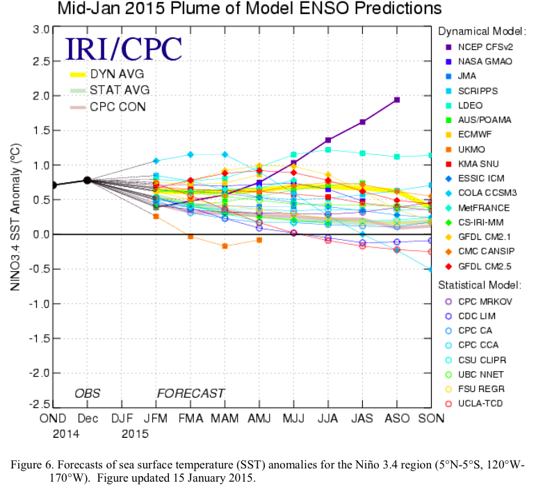 Similar to last month, most models predict a weak El Niño (3-month values of the Niño-3.4 index between 0.5°C and 0.9°C) during the Northern Hemisphere late winter and spring. The forecaster consensus also favors Niño-3.4 SST index values in excess of 0.5°C within the coming season. However, climatologically, ocean-atmosphere coupling tends to weaken into the spring, which increases uncertainty over whether El Niño conditions will emerge. In summary, there is an approximately 50-60% chance of El Niño within the late Northern Hemisphere winter and early spring, with ENSO-neutral slightly favored thereafter.