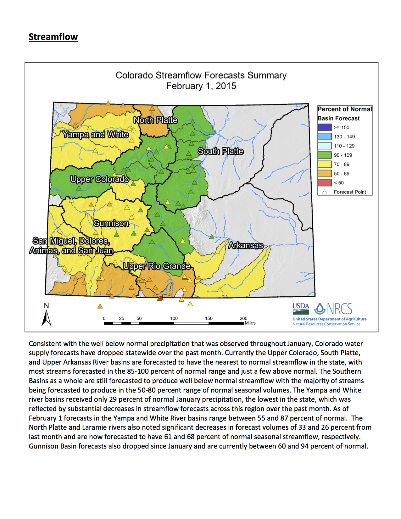 Domonkos said that although summer outlooks for streamflow volumes for April through July vary significantly around the state, most are forecasted to be between 60 percent and 85 percent of average.