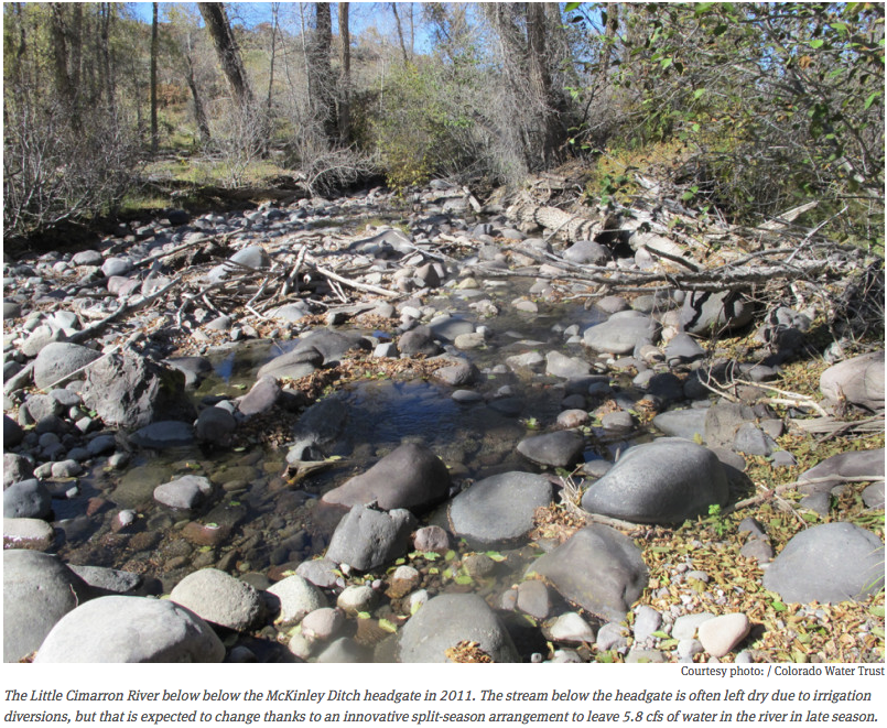 In the case of the Little Cimarron River, it will allow 5.8 cubic feet per second of water to flow past a diversion headgate in late summer down nine miles of river, including 3.3 miles of the Little Cimarron normally left nearly dry.