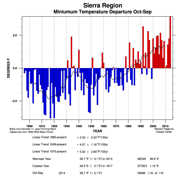 That’s a good reason to pay attention to the Sierra Nevada—not necessarily because of the drought, although that’s plenty interesting, too, but especially because of the warming temperatures. The trend line you saw…is the history by which to evaluate the future, and climate models point to a steady progression in the same, upward direction.