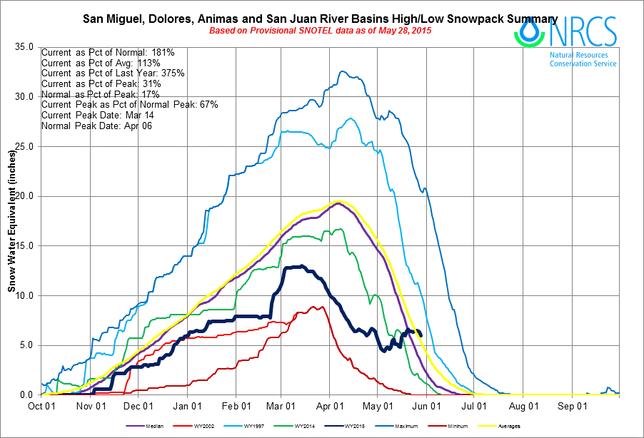 San Miguel, Dolores, Animas, and San Juan Basin High/Low graph May 28, 2015 via the NRCS From the Cortez Journal (Jim Mimiaga):