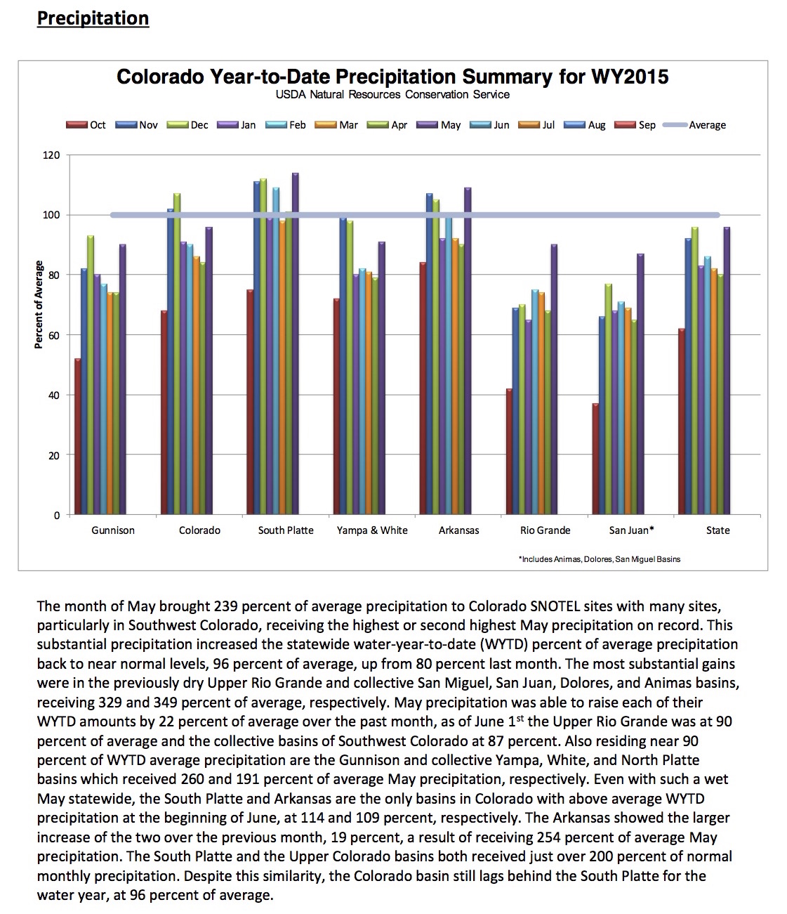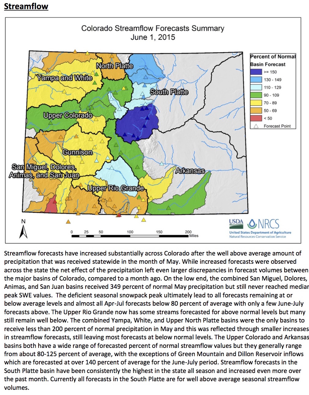 The month of May produced an impressive 239 percent of average precipitation across the mountains of Colorado, a welcome change from the two previous months of below average precipitation. This precipitation combined with cool temperatures at high elevations allowed for a prolongation of the snowpack during a time of year when snowmelt is often already well under way. “This substantial addition of moisture, both in the form of snow and rain have notably increased water supply forecasts across the state from a month ago,” comments Brian Domonkos, Colorado Snow Survey Supervisor.