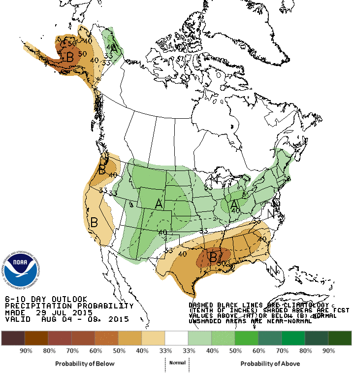 The 6-10 day and 8-14 day outlooks keep the area of below-normal temperatures across the Northern Rockies to Northeast, with warmer-than-normal temperatures expected for the southern tier States, West Coast, and most of Alaska. The greatest chances for above-normal precipitation during August 6-12 are expected to be across the Rockies, central to northern Plains, Midwest, and into the Northeast. Below-normal precipitation is expected over the southern Plains to Southeast, Far West, and most of Alaska.