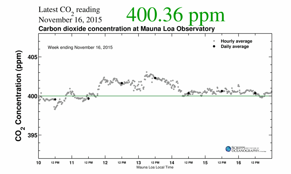 This week [November 22, 2015], you can watch as Earth passes a threshold not seen for at least a million years. The concentration of carbon dioxide in the air will rise above 400 parts per million. And scientists predict neither you nor your children will ever see it go below 400 ppm again.