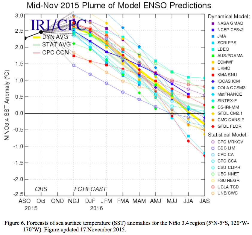 “We are currently in a very strong El Niño that should be reaching maximum intensity right about now,” Anderson said. He added conditions are expected to weaken to neutral by late spring or early summer.
