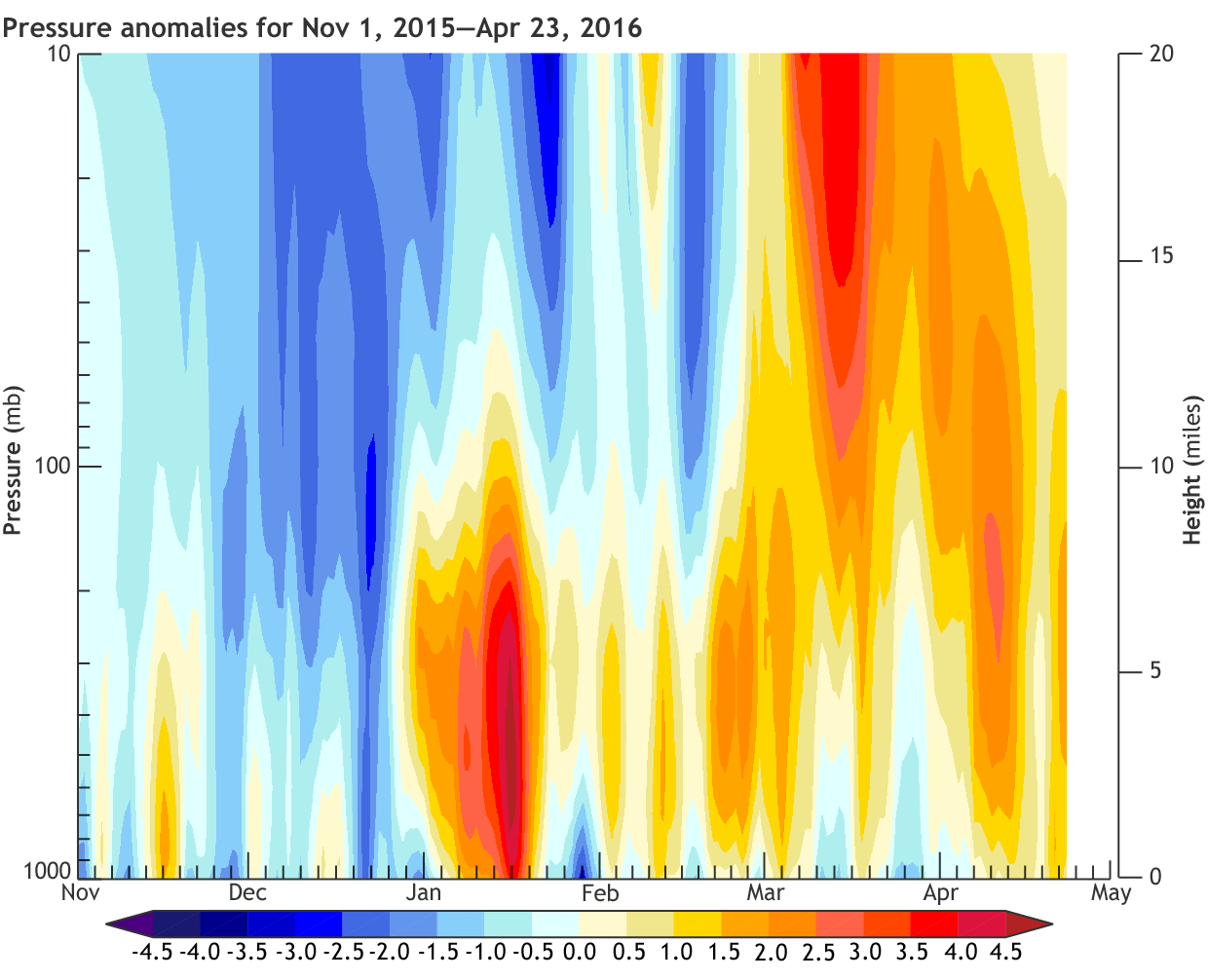65-90°N geopotential height anomalies (standardized by the JFM mean/standard deviation) for Nov 1 2015 – April 12 2016. Geopotential height is the height above the surface at which you find a given level of air pressure. A positive anomaly means the pressure is unusually high for a given altitude, which is generally linked to warmer than usual conditions. Negative anomalies mean lower pressure and colder air. In early winter, the vortex was anomalously strong (blue shading); in Jan/Feb, the stratosphere was largely decoupled from the troposphere; and in late winter, the vortex was anomalously weak (red shading) following a final major SSW on March 5.