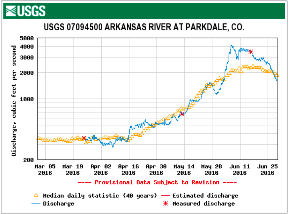 Snowpack piled up in late April and temperatures stayed cool in May, piling up a decent snowpack. Hot weather during most of June contributed to higher than average flows for the entire month. But that came to an end this week, as river levels at Parkdale and Avondale again hit the median mark.