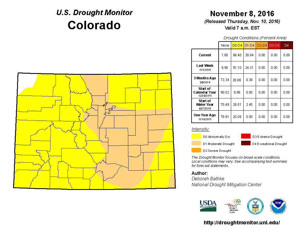 The U.S. Drought Monitor report, released Thursday, says 98.4 percent of Colorado is abnormally dry. Additionally, 30.84 percent of the state — including extreme western portions of Weld and much of the Front Range — is experiencing moderate drought, a more severe condition than abnormal dryness.