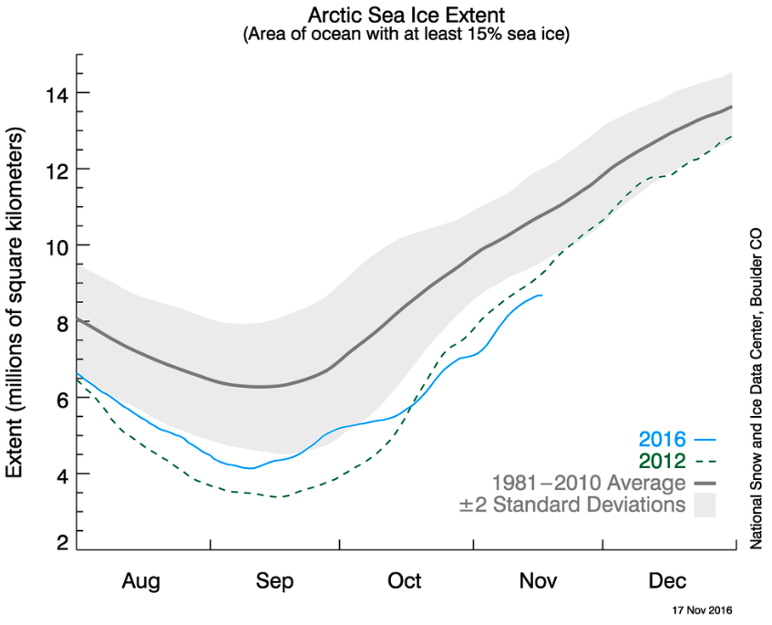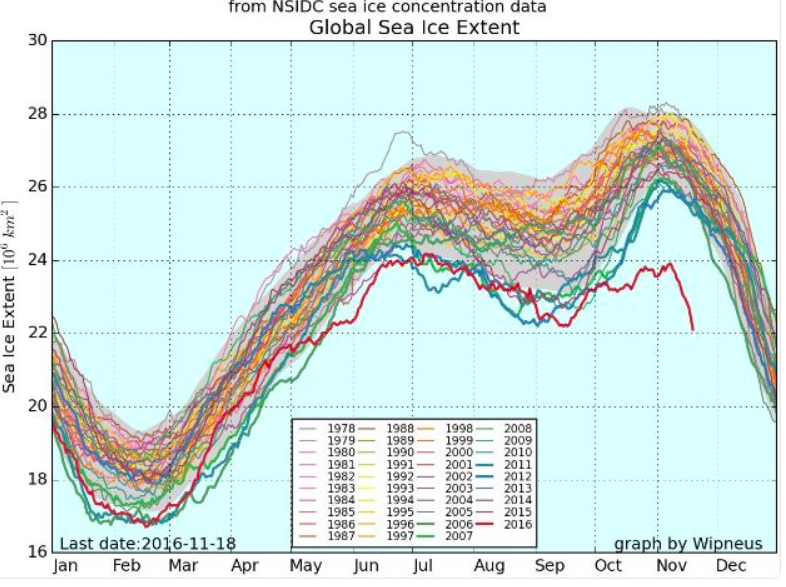 Global sea ice extent began 2016 (thick red line) at low levels. Just in recent days , the Arctic has lost more than a million square kilometers of sea ice, reaching a new record low and contributing to a steep decline in November’s total global sea ice extent. Antarctic sea ice extent is also at record low levels. Source: Arctic News