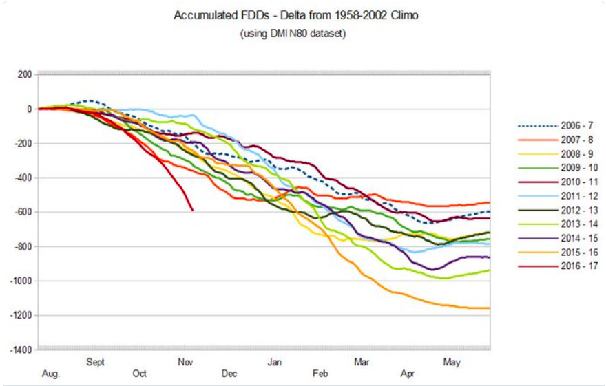 The chart below looks at this warmth by a different measure: “freezing degree days.” By many available measures, the oncoming Arctic winter is in a nose dive unprecedented in recent record keeping.