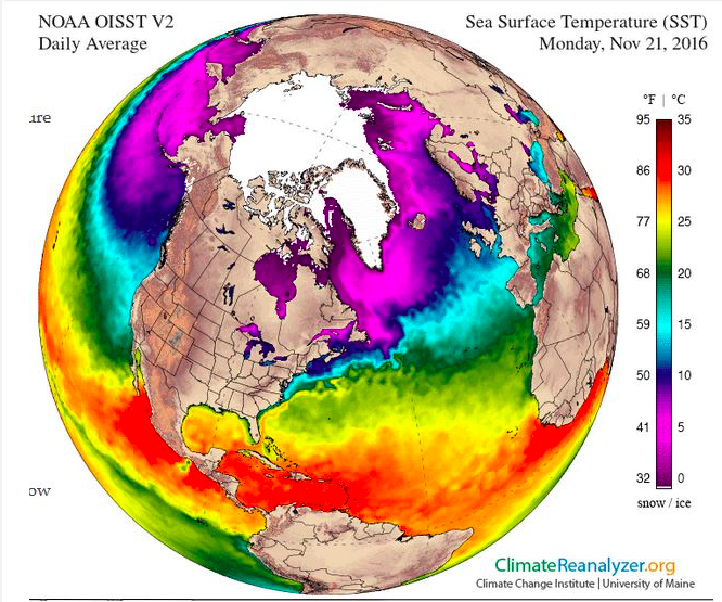 This fall, sea surface temperatures are well above average, with anomalous warmth persisting into November as seen in the figure below. Scientists have reported ocean temperatures 25° F above average in some locations.