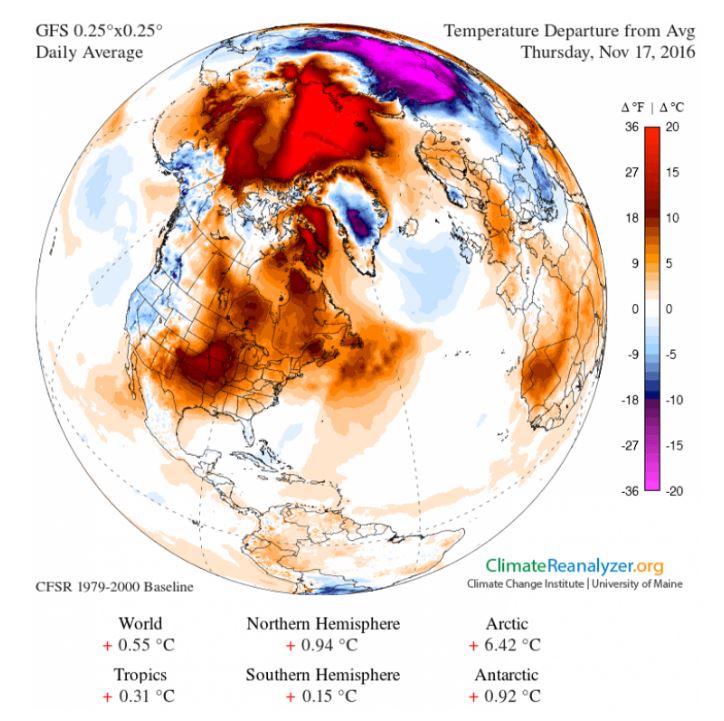 The combination of factors driving Arctic air temperatures today has resulted in a stunning temperature anomaly—persistent, vast areas of 36° F above normal, shown in the map below.