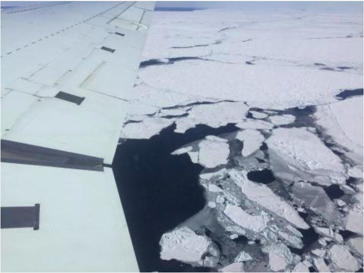 This photograph from NASA Operation IceBridge shows broken floes of sea ice floating in the Weddell Sea. A large area of open water can be seen on the horizon. Credit: J. Beitler/National Snow and Ice Data Center.