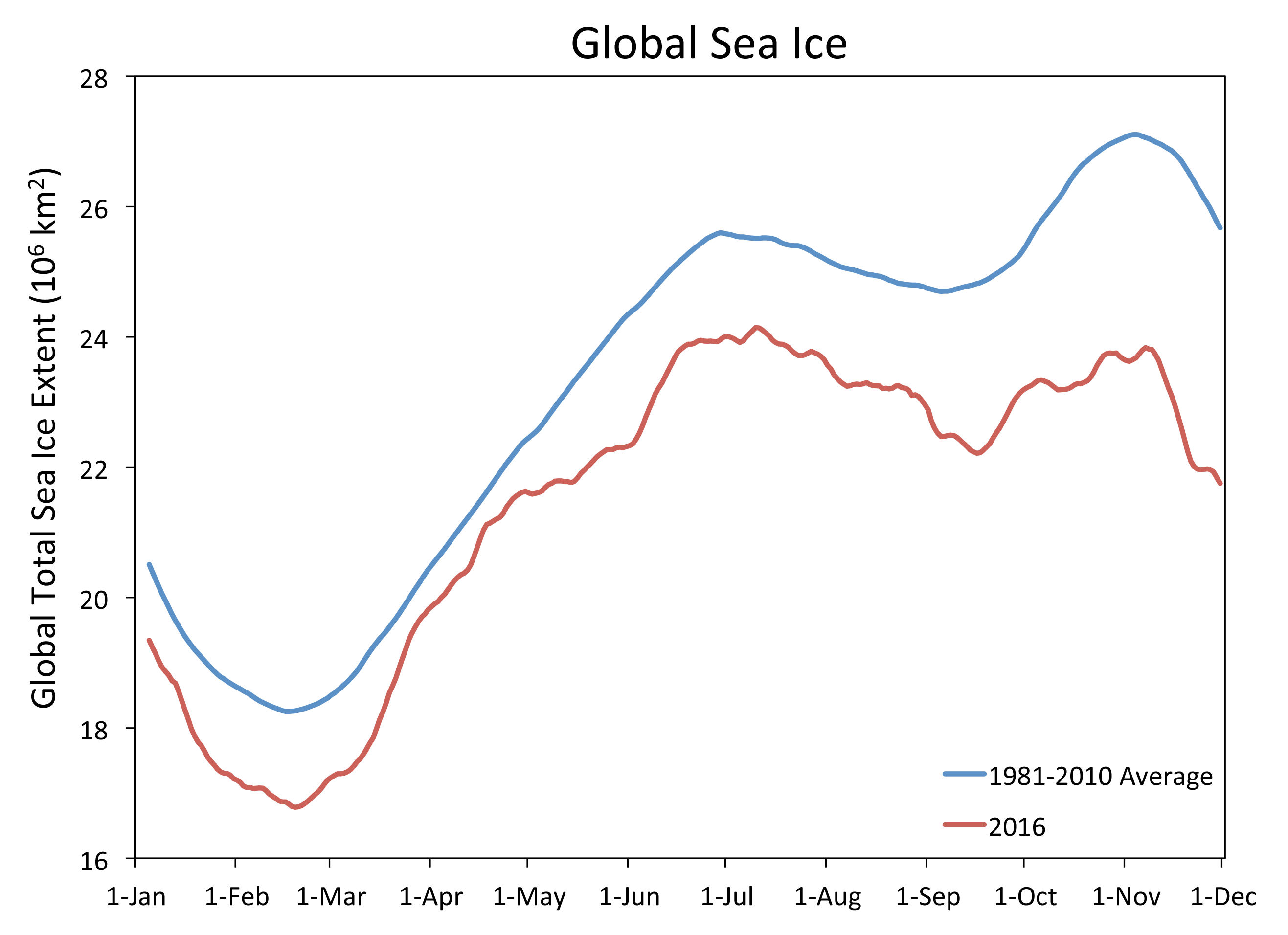 This time series of daily global sea ice extent (Arctic plus Antarctic, month and first day of month on the x axis) shows global extent tracking below the 1981 to 2010 average. Sea Ice Index data.
