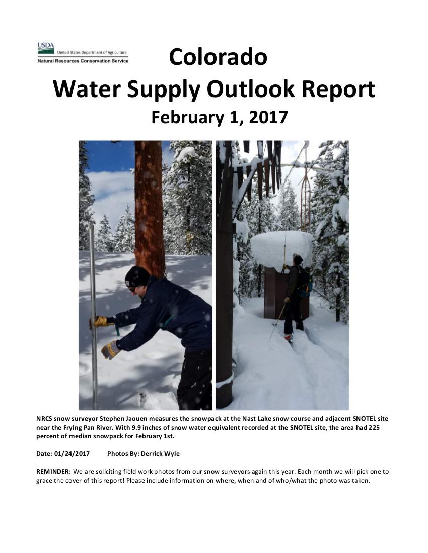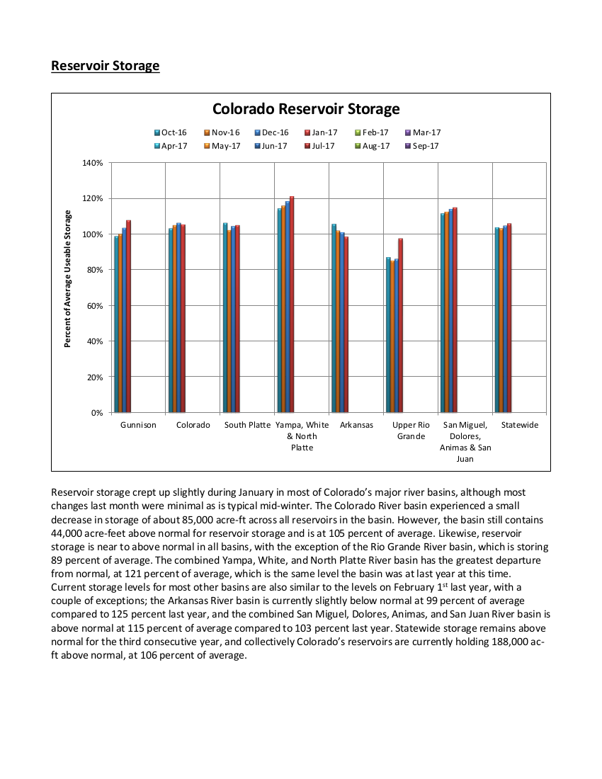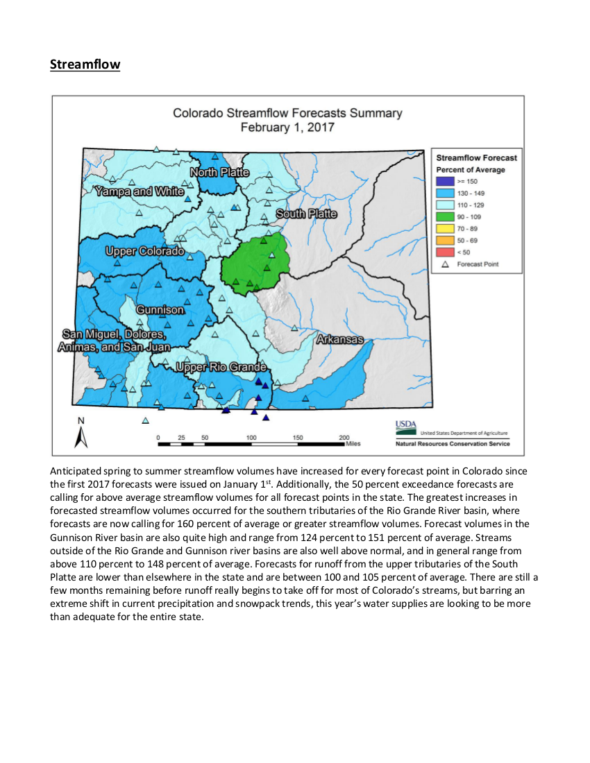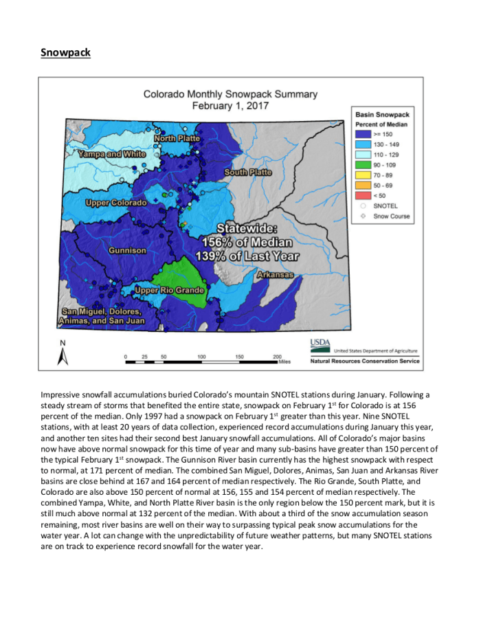 Colorado received well above normal mountain precipitation and snowpack accumulation throughout the month of January, with all but one major basin receiving more than twice the normal amount of monthly precipitation. The combined Yampa, White, and North Platte basins experienced the lowest January precipitation at 187 percent of average and the Gunnison had the highest at 251 percent. Statewide January precipitation was 217 percent of average. This substantial accumulation of precipitation left the statewide snowpack at 156 percent of normal as of February 1st, a notable increase from the 114 percent that was recorded as of January 1st. Streamflow forecasts across the state range from near to well above normal seasonal volumes. On the low end there are several forecast points in the South Platte basin that are currently forecast to have between 101-110 percent of their average April-July streamflow volumes. While most streamflow forecasts in the state range between 110-150 percent of normal, there are several streams in the Upper Rio Grande basin that are forecast to have between 175-185 percent of average streamflow this season. Reservoir storage has remained relatively constant, relative to normal, throughout this water year and is currently 106 percent of average statewide.