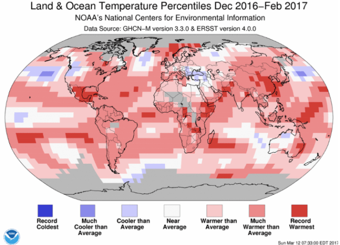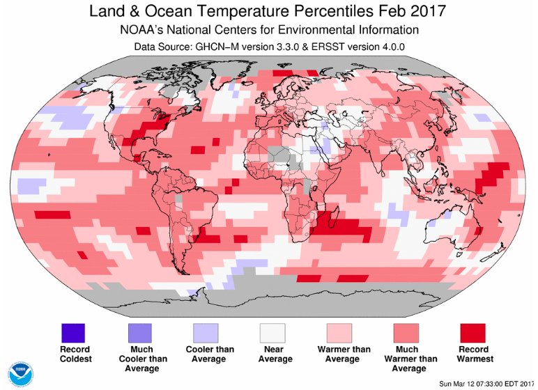 The globally averaged temperature over land and ocean surfaces for February 2017 was the second highest for the month of February in the NOAA global temperature dataset record, which dates back to 1880. The December–February seasonal and year to date global temperatures were also second warmest on record.