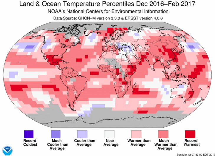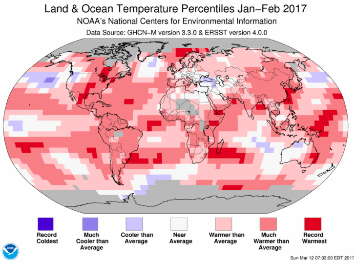 The December–February average temperature across global land and ocean surfaces was 1.60°F above the 20th century average of 53.8°F. This was the second highest for December–February in the 1880–2017 record, trailing behind 2015/16. The globally averaged land surface temperature for December–February was 2.74°F above the 20th century average of 37.8°F. This was the second highest for December–February in the record, behind 2015/16. The December–February globally averaged sea surface temperature was 1.19°F above the 20th century average of 60.5°F – also the second highest for December–February in the record, behind the record set during 2015/16. Year-to-Date (January–February 2017)
