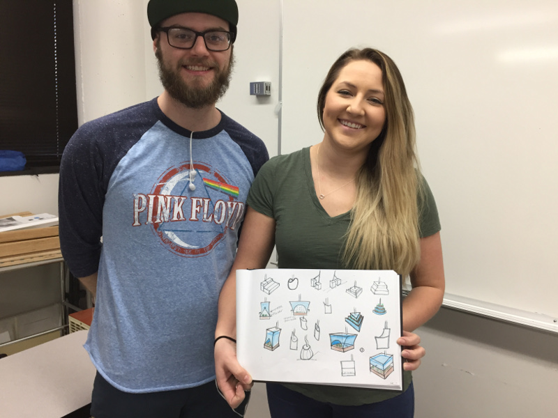 Industrial design students show some of their early sketches of a rain barrel. Photo: Tom Cech