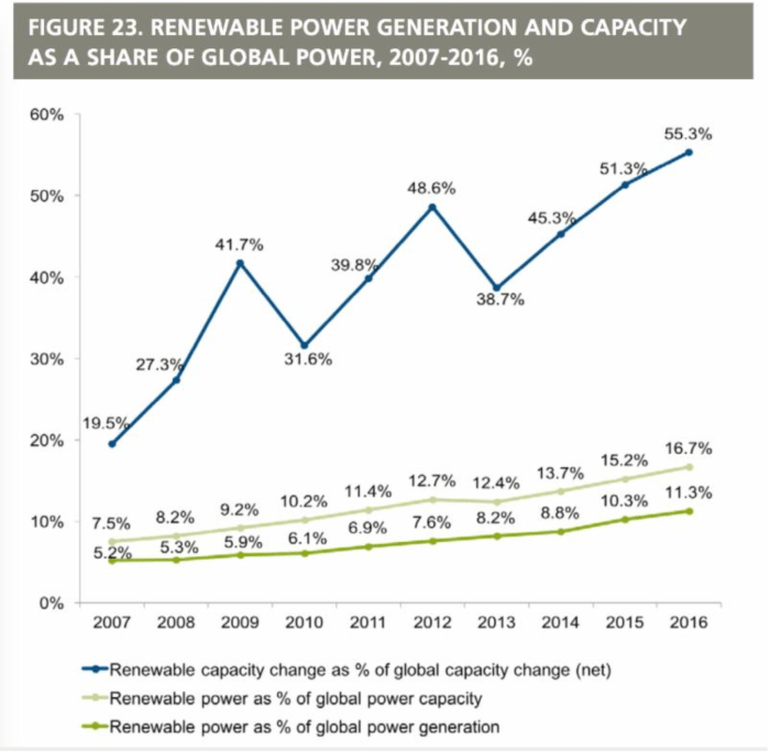 Specifically, according to the United Nations Environment Programme (UNEP), global investment in renewable energy for 2016 came in at $241.6 billion, 23% less than in 2015, but nevertheless helped to deploy 138.5 gigawatts (GW) of new renewable energy capacity (excluding large-hydro), a figure up 8% from the 127.5 GW installed in 2015. The new report UNEP report, Global Trends in Renewable Energy Investment 2017, found that the total investment level was the lowest it has been since 2013, due in large part to falling costs, rather than a drop in demand.