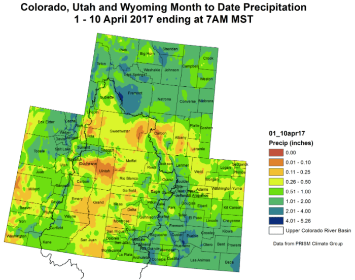 Weekly Climate, Water and #Drought Assessment of the Intermountain West — @ColoradoClimate Upper Colorado River Basin month to date precipitation through April 10, 2017 via the Colorado Climate Center. Click here to read the current assessment. Click here to go to the NIDIS website hosted by the Colorado Climate Center. Share this: Share on Bluesky (Opens in new window) Bluesky Share on LinkedIn (Opens in new window) LinkedIn Share on Facebook (Opens in new window) Facebook Email a link to a friend (Opens in new window) Email Print (Opens in new window) Print Share on X (Opens in new window) X Like this:Like Loading...