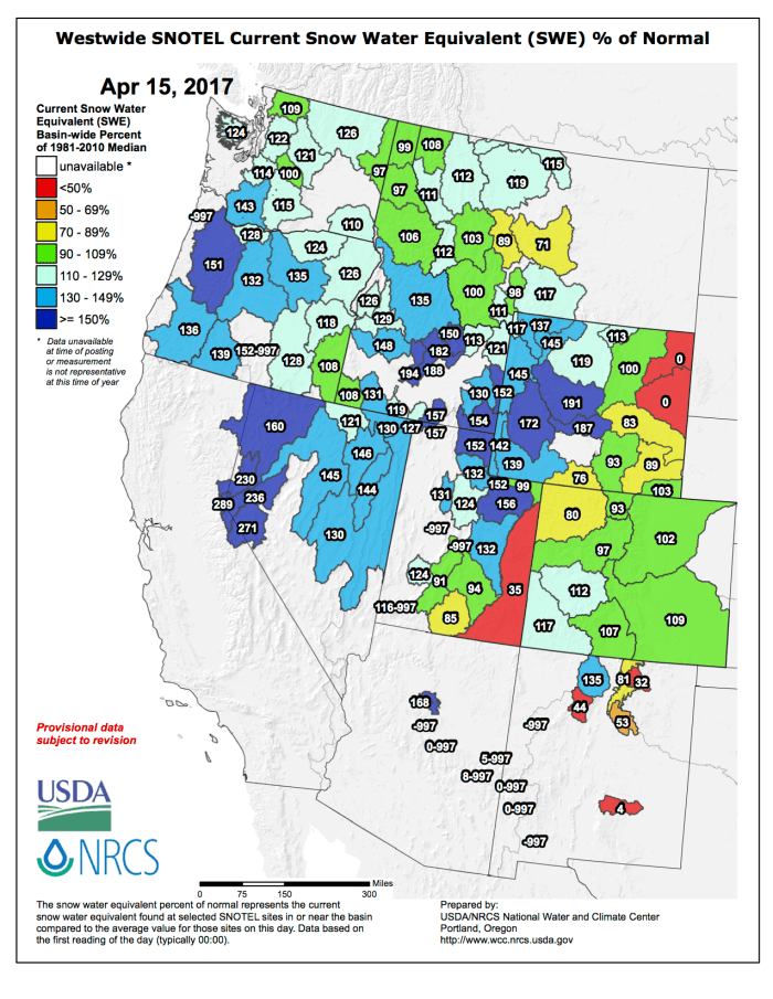 Relatively good snowpack remains in the Gunnison, Arkansas, and combined San Miguel, Dolores, Animas and San Juan basins, all above 118 percent of normal. Only the combined Yampa and White basins are now below normal.