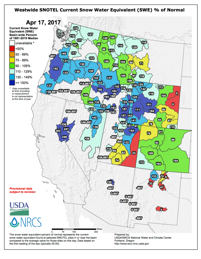 Kandl pulled up a map of the western United States that detailed the results of the winter storm track over the Sierras and into northern Utah, where streamflow forecasts were 180 percent of average. From there, levels begin to drop off.
