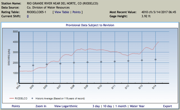 The Rio Grande currently has twice as much water flowing through it than is typical for this time of year. On Friday, the river gauge at the village of Embudo recorded 4,020 cubic feet per second, which is more than double the 85-year average for the same date.