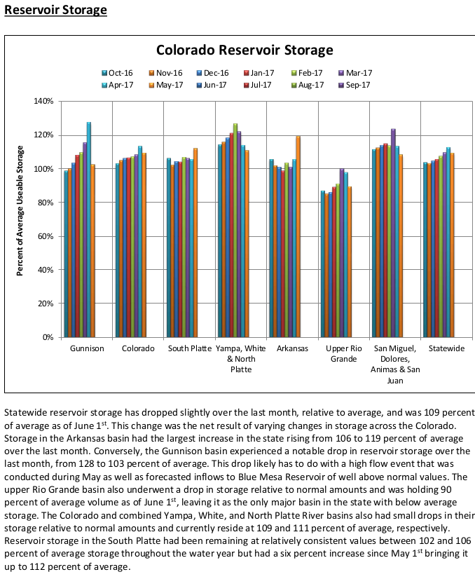 Reservoir storage statewide was at 109 percent as of the start of June, the agency reports. Thatās also where things stand for storage in the Colorado River basin, while storage in the Gunnison basin is at 103 percent.