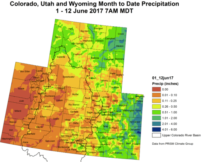 @ColoradoClimate: Weekly Climate, Water and #Drought Assessment of the Intermountain West Upper Colorado River Basin month to date precipitation through June 12, 2017 via the Colorado Climate Center. Click here to read the current assessment. Click here to go to the NIDIS website hosted by the Colorado Climate Center. Share this: Share on Bluesky (Opens in new window) Bluesky Share on LinkedIn (Opens in new window) LinkedIn Share on Facebook (Opens in new window) Facebook Email a link to a friend (Opens in new window) Email Print (Opens in new window) Print Share on X (Opens in new window) X Like this:Like Loading...