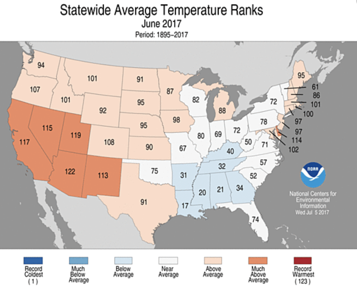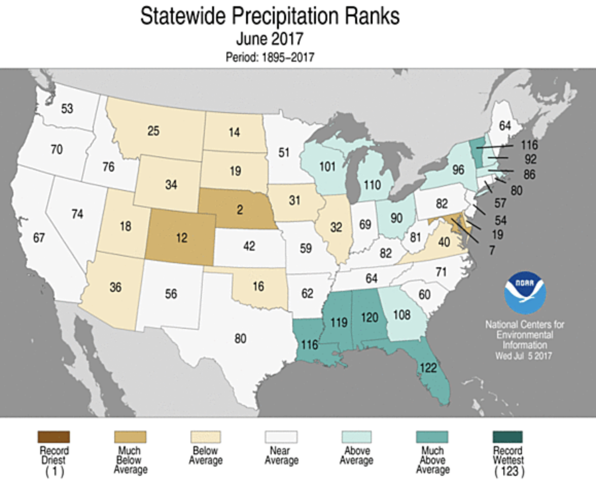 June 2017 Statewide Precipitation Ranks via NOAA.