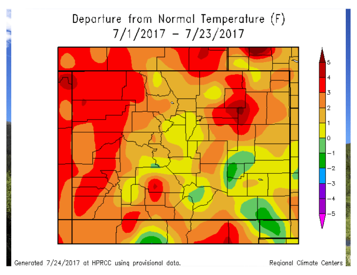June was characterized by warm and dry conditions; statewide it was the 12th driest June on record and the driest we have seen since 2013. Above average temperatures have continued into July, particularly on the west slope where it has been as much as four degrees above average. Consequently, abnormally dry conditions have expanded west of the divide, should we have a strong monsoon season these conditions may be abated. Reservoir storage remains high, and municipal water providers have no immediate concerns with levels of supply and demand in their systems.
