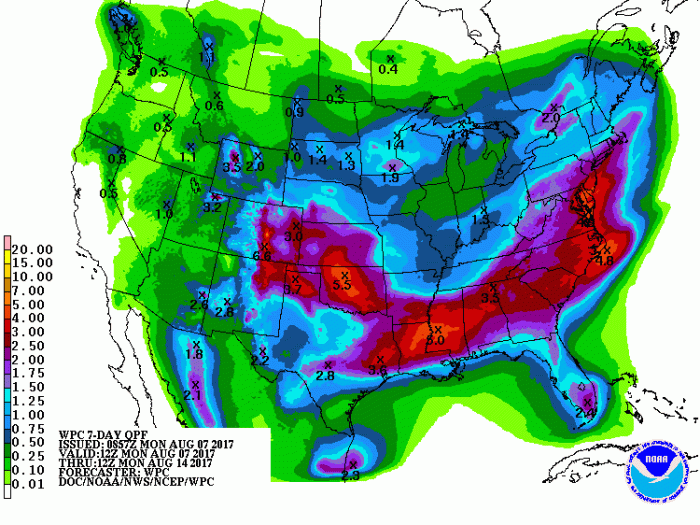 The national Climate Prediction Center forecasts that August will see below-normal temperatures and above-normal rain in August.