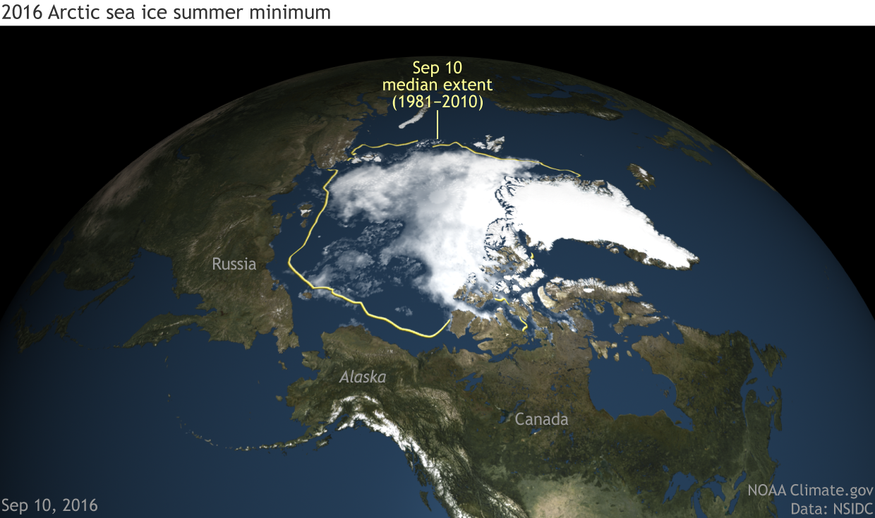 Arctic sea ice concentration on the date of the 2016 minimum extent, September 10, 2016. NOAA Climate.gov image based on NOAA and NASA satellite data from NSIDC.