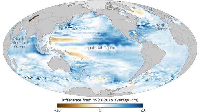 Global sea level in 2016 compared to the 1993-2016 average. NOAA Climate.gov graphic, adapted from Figure 3.16a in State of the Climate in 2016.