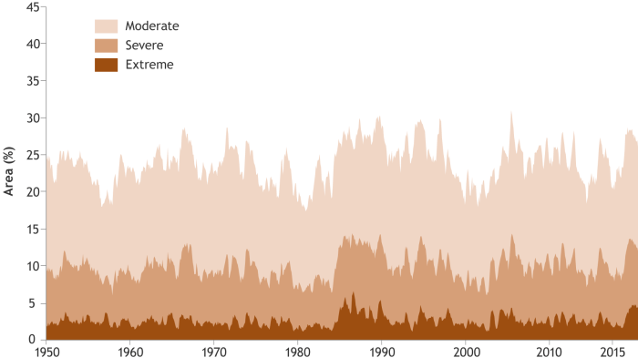 Areas experiencing drought in 2016 compared to average conditions for that region from 1901-2016. NOAA Climate.gov map, adapted from Figure 2.1q in State of the Climate in 2016.Percent of the global land area experiencing moderate, severe, or extreme drought each month from 1950–2016. NOAA Climate.gov graph adapted from FIgure 2.29 in State of the Climate in 2016.