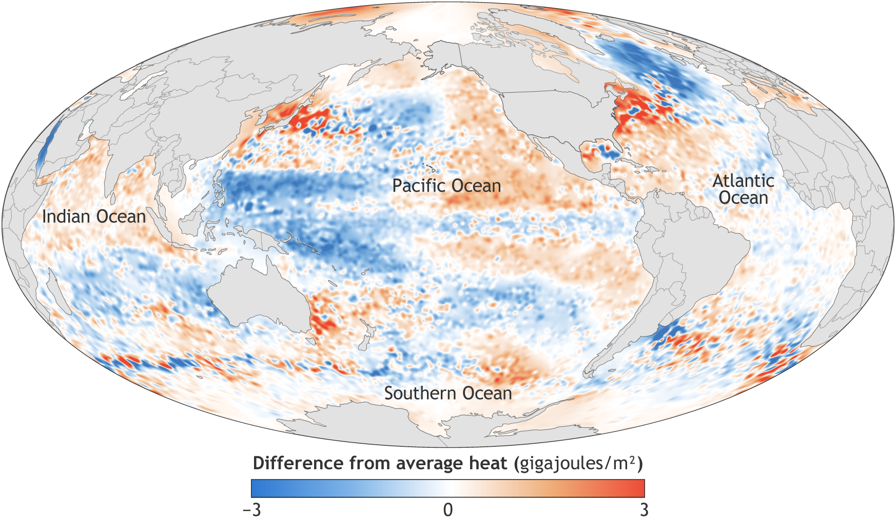 Heat energy in the global ocean in 2016 compared to the 1981-2010 average. Map by NOAA Climate.gov, adapted from Figure 3.4a in State of the Climate in 2016.