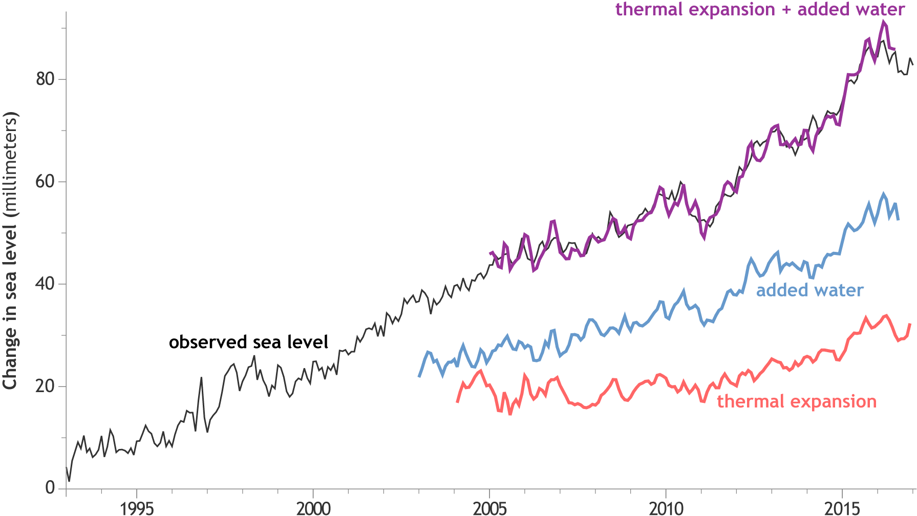 Global sea level since the start of the satellite record in 1993 (black line). Independent estimates of the amount of the trend due to thermal expansion (water volume increasing due to warming) are shown in red. The blue line shows an independent estimate of the amount of water being added to the ocean by melting of ice sheets and glaciers. The purple line shows the sum of the two contributions and how well the estimate matches the satellite observation. NOAA Climate.gov graphic, adapted from Figure 3.15a in State of the Climate in 2016.