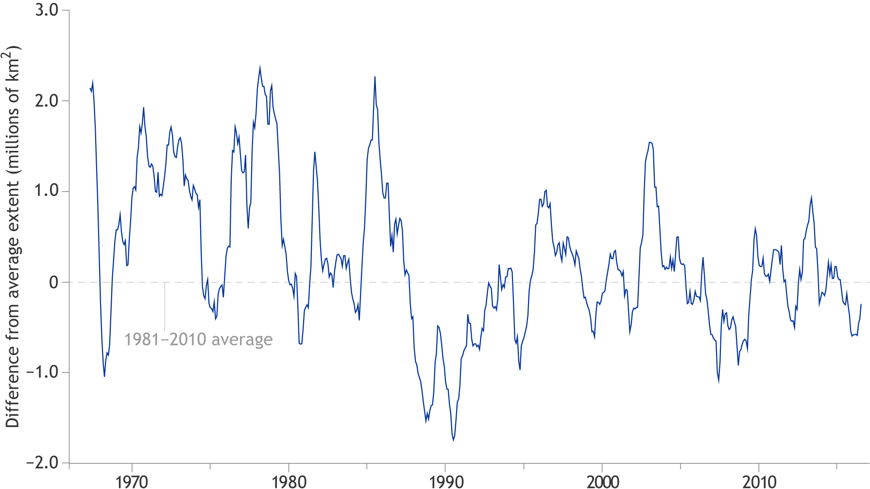 Monthly snow cover extent over the Northern Hemisphere relative to their 1981-2010 averages. NOAA Climate.gov graphic, adapted from Figure 2.12 in State of the Climate in 2016.