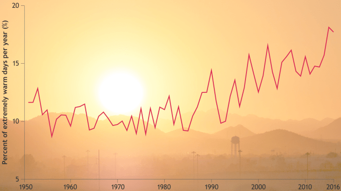 As the global average temperature has risen, so has the number of extremely hot days that occur each year. This graph tracks the changing frequency of days on which the temperature was in the 90th percentile of the historical record since 1950. Graph by NOAA Climate.gov, adapted from Plate 1.1g in State of the Climate in 2016. Background photo by Bob James via a Creative Commons license.