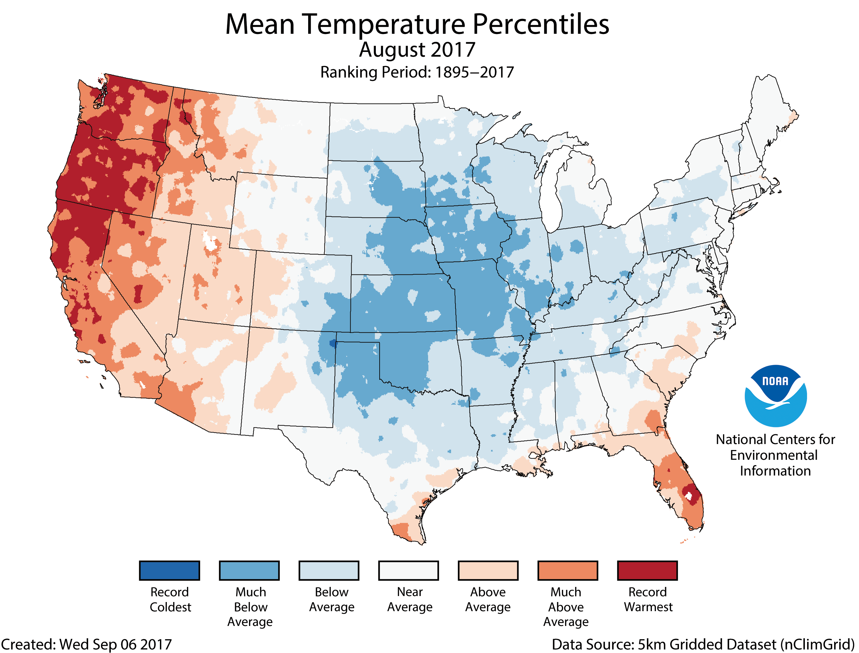 For the month of August, much-below-average temperatures in the Midwest and High Plains offset the record warmth along the West Coast. The August national temperature was near average at 72.0°F, 0.1°F below average, tying 1921 as the 53rd coolest on record. The August precipitation average for the contiguous U.S. was 3.34 inches, 0.7 inch above average, the seventh wettest in the 123-year period of record.