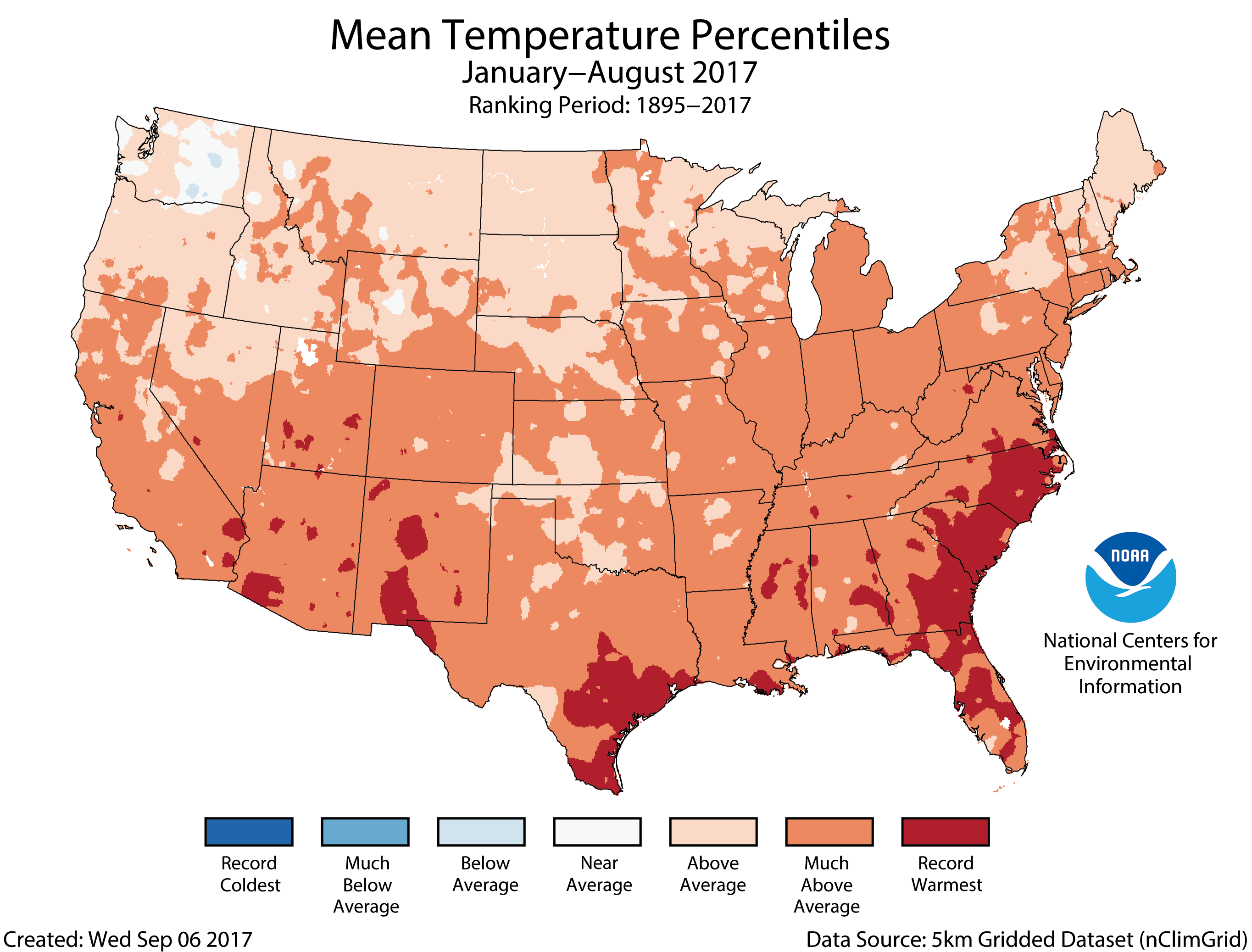 Texas was record wet, mostly due to powerful and slow-moving Hurricane Harvey and its remnants. Precipitation across the state averaged 6.57 inches, 4.26 inches above average. Louisiana averaged 12.64 inches, 8.0 inches above average, resulting in its second wettest August, 0.38 inch shy of the record set just in 2016, which also saw widespread very heavy rainfall and flooding. Locally in areas of Texas and Louisiana, precipitation amounts were historic due to Hurricane Harvey. At least 22 stations reported more than 500 percent of normal, or five times their normal rainfall for August. Monthly totals in excess of 40 inches were recorded by long-time NOAA observers in Lumberton, Beaumont, and at the Houston National Weather Service office. Other August Weather and Climate Indicators