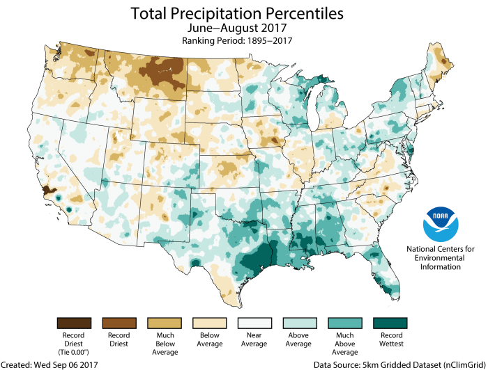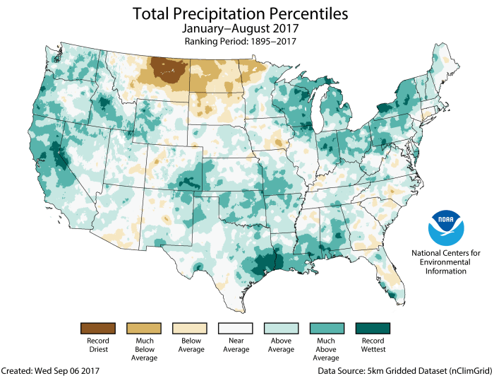 Although the August temperature was categorized as near-average nationally, there were stark regional differences. The western U.S. was very warm, while the central U.S. was quite cool. California, Oregon, and Washington each had their warmest August on record. The California statewide average temperature of 77.8°F tied with 1967 and 2012 at 4.1°F above average. Oregon’s average temperature was 69.8°F, 5.9°F above average. Washington’s was 68.7°F, 5.2°F above average. Average temperatures in parts of the High Plains and Midwest were much below average for August, owing especially to much cooler than average afternoons in the region. Missouri had its seventh coolest August on record with an average temperature of 72.0°F, 4.0°F below average. It was the eighth coolest in Iowa and Kansas, the ninth coolest in Oklahoma, and the 10th coolest in Illinois and Nebraska. August Precipitation, Including Hurricane Harvey