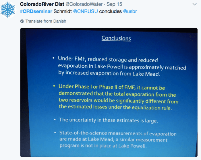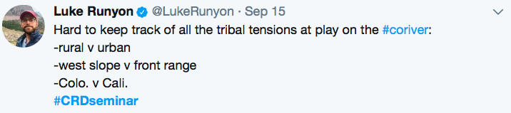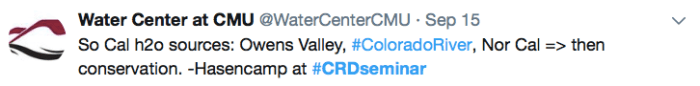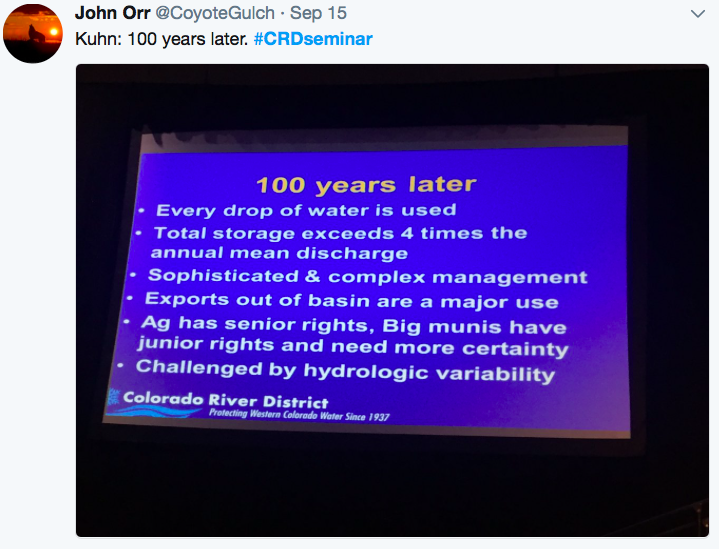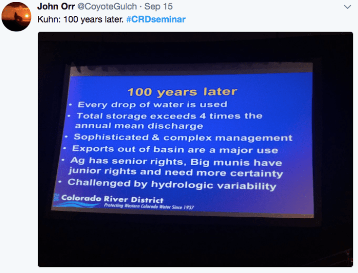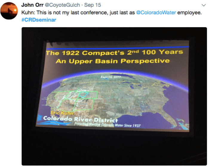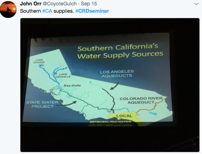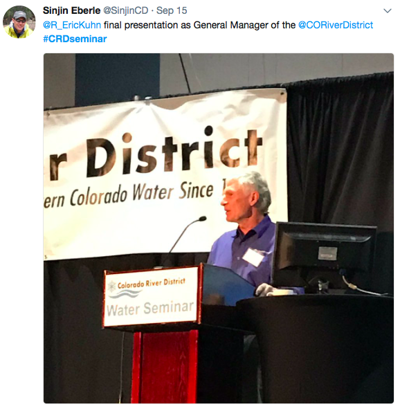 He assured folks in the room, on Twitter and live on Facebook that the seminar was not his last, just his last as the GM of the district he worked at for 34 years. In his early retirement he is authoring a book on Colorado River hydrology that he hopes will “de-nerdify” the subject and appeal to a wide audience. The water nerds in the room all hoped to snag a copy as soon as is it avaiable.